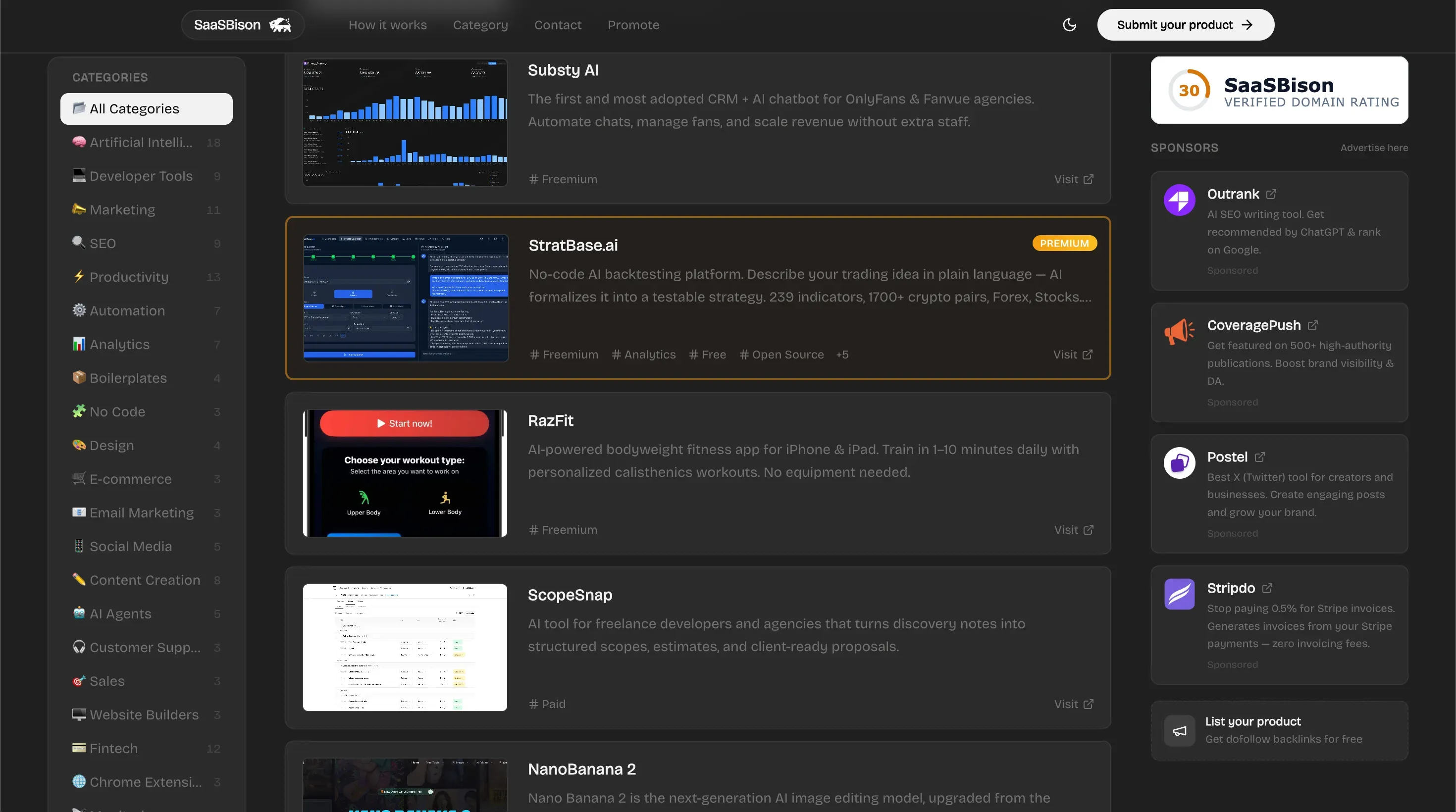 SaaSBison is an SEO-focused software directory that helps businesses gain visibility through permanent listings while providing valuable dofollow backlinks to improve domain authority and search rankings. The platform serves as a discovery hub for software tools and SaaS alternatives across multiple categories.